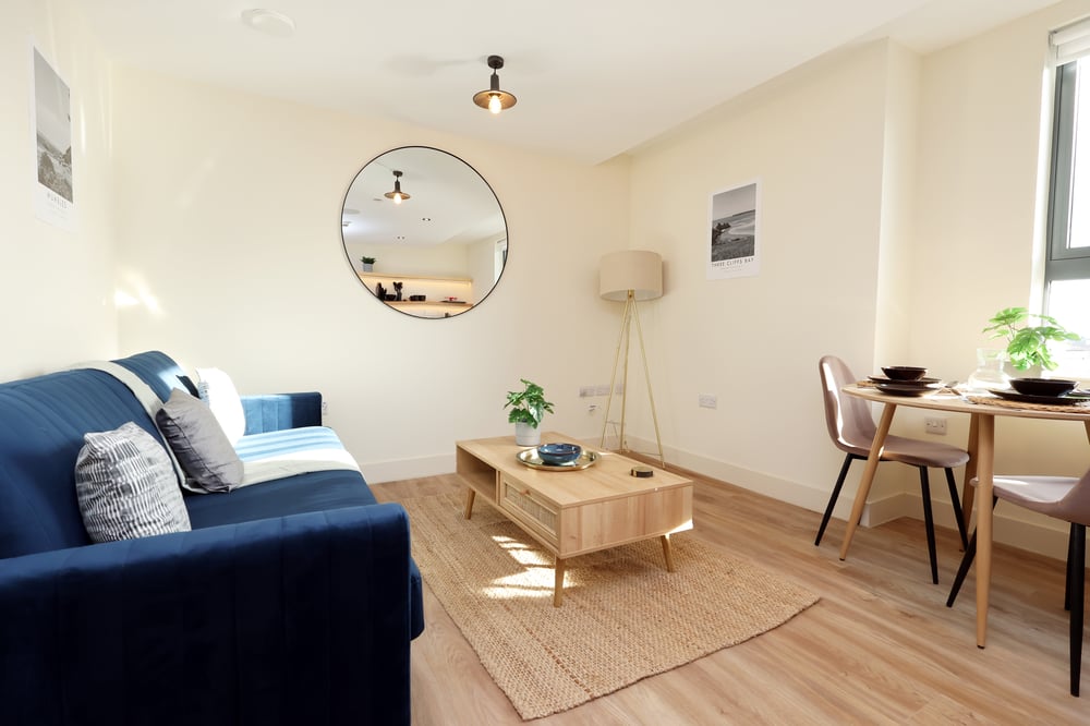 Our one-bedroom apartment is thoughtfully arranged in a bright, open-plan layout that maximises both space and comfort. The main living area combines the lounge, dining and kitchen into one cohesive space. A contemporary kitchen runs along one wall, fully fitted with integrated oven, hob, microwave, kettle and essential cookware. Open shelving with warm lighting adds a stylish touch. Beside the window, a round dining table comfortably seats two. The lounge area features a comfortable sofa, coffee table and soft furnishings, creating a cosy spot to relax. Large windows allow plenty of natural light throughout. The separate bedroom includes a king-size bed with bedside tables, lighting and hanging space for clothes. The bathroom is modern and compact, fitted with a walk-in shower, WC and sink with sleek black tile detailing. The on-site food court, located within the building, serves as the primary food and drink offering, giving guests convenient access to a variety of dining options just steps from the apartment.