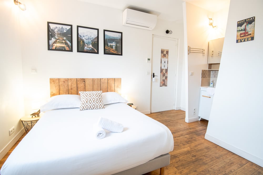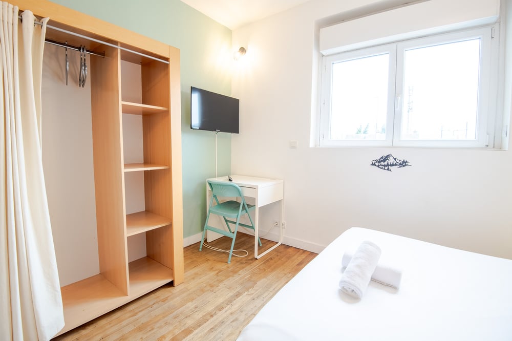 Take to the skies and discover this perfect space for travelers looking for conviviality and comfort, while enjoying their own privacy. Located on the first floor of a building (1 studio and 5 bedrooms in total), this room for 2 people will provide you with all the necessary comfort for your stay. A cozy double bed will allow you to rest after a day of work or sightseeing. You can relax while watching TV (thanks to Chromecast) and enjoying the Fiber Wifi connection at your disposal. For your comfort, the studio is equipped with reversible air conditioning. You will have a shower (open to the bedroom) and a separate toilet in your room. The kitchen is shared and located on the ground floor of the building. The latter, very spacious, will allow you to concoct good little dishes like at home (oven, fridge, hotplates, Senseo coffee maker, raclette machine, etc.). You can also enjoy the lounge area with sofas, a large TV and board games. For sunny days, you will also have access to a shared garden, perfect for enjoying sunny days and chatting with other residents if you wish. You can travel light without worrying about anything: hotel-quality sheets and towels are at your disposal and cleaning is carried out by a professional company. Arrivals and departures are done independently via connected locks. The entrance hall of the building is under video surveillance. We are waiting for your reservation :)