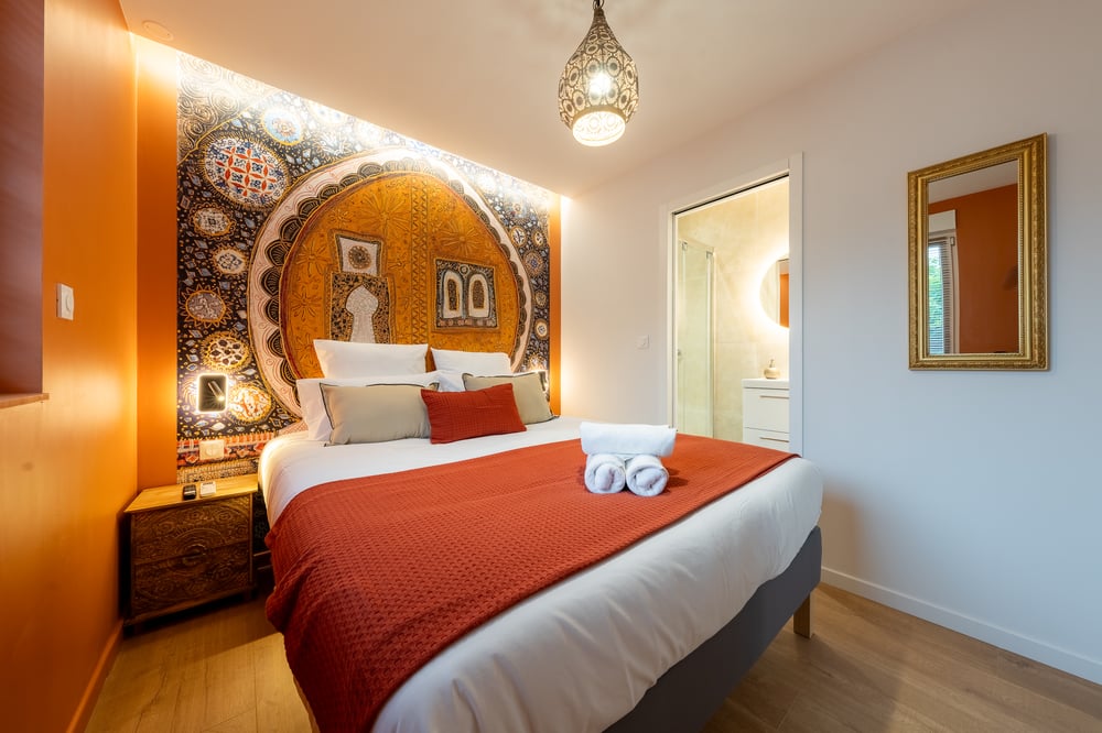 Marrakech • 22 m² cocoon offering the perfect blend of comfort and escape: premium memory foam mattress, ultra-fast Wi-Fi, secure parking with video surveillance, and a warm, ambient lighting atmosphere. Ideal for both business trips and leisure stays, this studio combines sleek design with modern amenities for a truly relaxing experience.