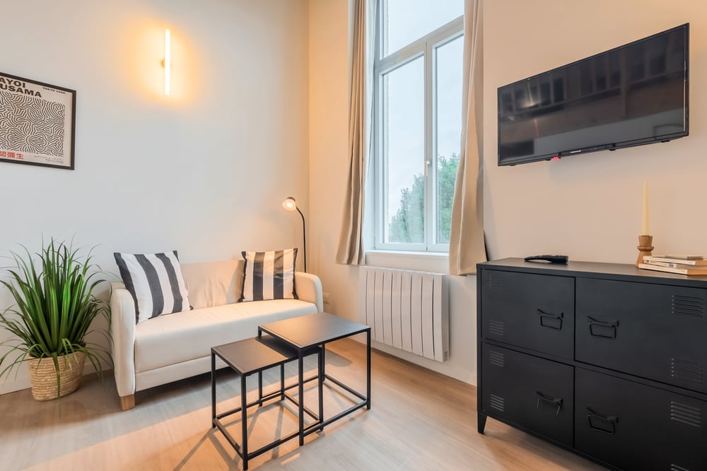 The apartment, located on the garden side, composed as follows: - Living room with open kitchen and small lounge area (with connected TV) - Bathroom with shower, sink and WC - Sleeping area on the mezzanine (note, the ceiling height of the mezzanine is 1m10) with a second television Please note that the accommodation is not suitable for people with reduced mobility. Please also note that the accommodation does not have shutters, only blackout curtains. You will have access to washing machines (shared with the other occupants) in a room located in the cellar (level -1). The accommodation will be carefully prepared for your arrival: Professional cleaning service + laundry for linens. All linen is provided: bed linen, bath towels, bath mats and tea towels. The kitchen is equipped with all the utensils and dishes for lunch and dinner. Here is the entertainment available to you via TV: Molotov TV and Prime Video.
