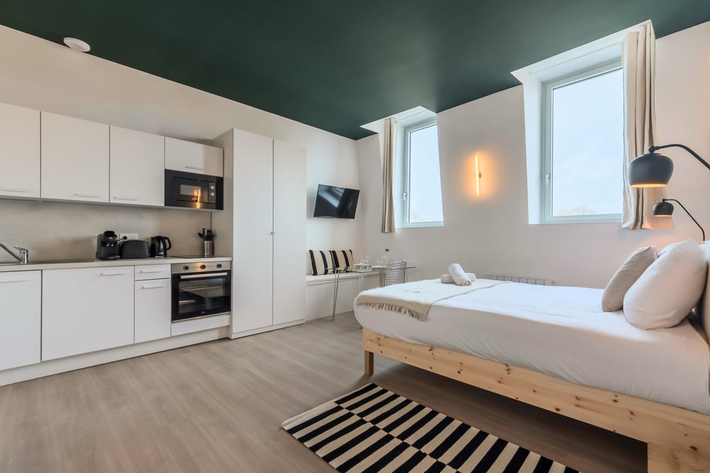 The apartment is composed as follows: - Living room with open kitchen - Bathroom with shower cubicle, sink and toilet - Double bed with quality bedding Please note that the accommodation does not have shutters, only blackout curtains. You will have access to washing machines (shared with the other occupants) in a room located in the cellar (level -1). The accommodation will be carefully prepared for your arrival: Professional cleaning service + laundry for household linen. All linen is provided: bed linen, bath towels, bath mats and tea towels. The kitchen is equipped with all utensils and dishes for lunch and dinner. Here is the entertainment at your disposal via TV: Molotov TV and Prime Video.