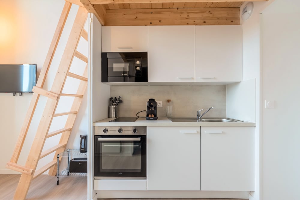 The apartment, located on the street side, is composed as follows: - Living room with open kitchen and lounge area (with connected TV) - Bathroom with shower, sink and toilet - Sleeping area on the mezzanine (be careful, the ceiling height of the mezzanine is 1m10) with a second television Please note that the accommodation is not suitable for people with reduced mobility. Please also note that the accommodation does not have shutters, only blackout curtains. You will have access to washing machines (shared with the other occupants) in a room located in the cellar (level -1). The accommodation will be carefully prepared for your arrival: Professional cleaning service + laundry for household linen. All linen is provided: bed linen, bath towels, bath mats and tea towels. The kitchen is equipped with all the utensils and dishes for lunch and dinner. Here is the entertainment at your disposal via TV: Molotov TV and Prime Video.