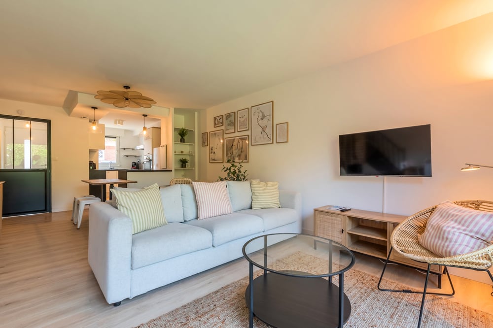 /!\ RESERVATIONS FOR PARTY PURPOSES ARE STRICTLY PROHIBITED. ANY COMPLAINTS FROM NEIGHBORS OR THE POLICE WILL RESULT IN A FULL DEPOSIT WITHDRAWAL /!\ The house is composed as follows: Ground floor: - Large living room with open kitchen, lounge area and dining room - Separate WC - Access to the garage (the dimensions are 2 meters high, 2 meters wide and just over 4 meters deep) - Garden with trees at the back of the house 1st floor: - Bathroom with bath, shower, sink and WC - A bedroom with a 160x200 double bed - A bedroom with a 140x200 double bed - Two bedrooms with two single beds The accommodation will be carefully prepared for your arrival: Professional cleaning service + laundry for linens. All linen is provided: bed linen, bath towels, bath mats and tea towels. The kitchen is equipped with all the utensils and dishes for lunch and dinner. Here is the entertainment available to you via TV: Molotov TV and Prime Video.