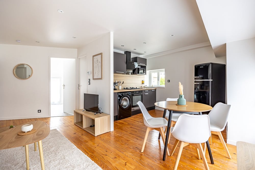 Équinoxe • Discover Annonay and the treasures of the Ardèche during your getaway or business trip. In the land of the Montgolfier brothers, where their balloon first took flight, you'll find a beautiful 50 sqm apartment, elegantly renovated and fully equipped, offering a charming and timeless stay. ✑ GOOD TO KNOW: The apartment is located on the 6th floor with no elevator.