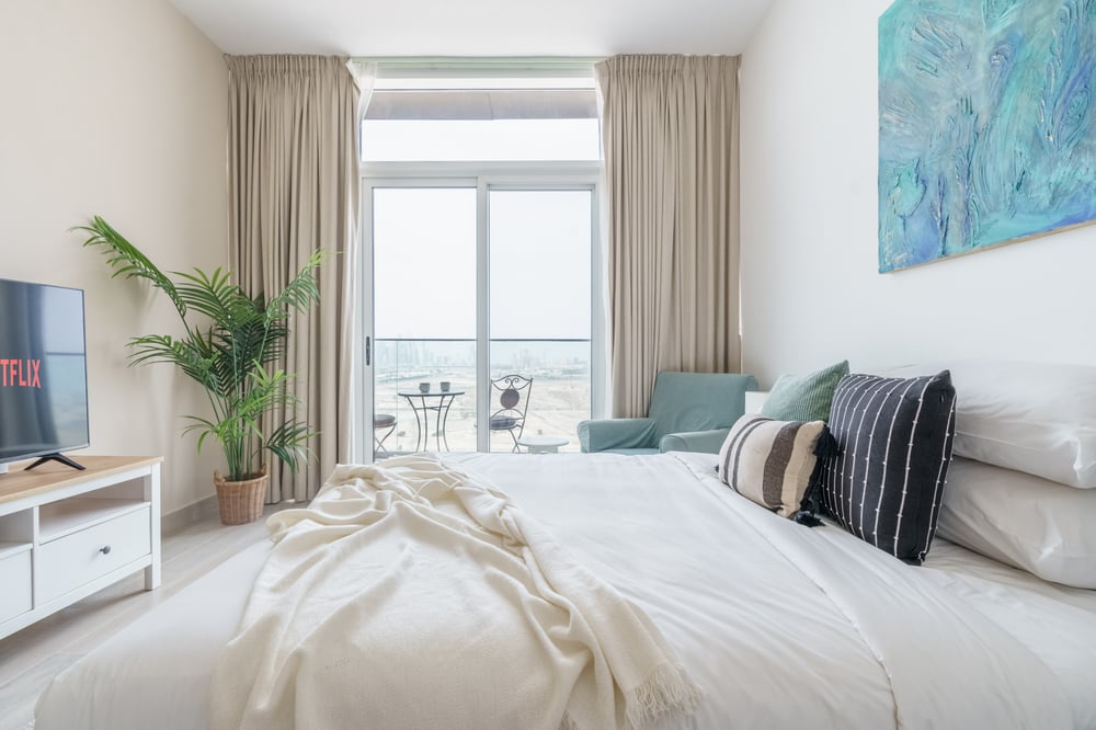 Bem-vindo à minha casa! Este estúdio está situado num complexo luxuoso e seguro no tranquilo bairro residencial de Jumeirah Village Circle, apenas a 25 minutos do centro do Dubai. Oferece vistas deslumbrantes sobre o pátio central. Concebido com uma área de estar de piso aberto, o estúdio é um local tranquilo para se retirar após um longo dia na cidade. A sala de estar tem uma agradável cama de casal com roupa de cama de qualidade de hotel gratuita. A kitchenette está totalmente equipada com utensílios de cozinha e talheres essenciais, incluindo um fogão elétrico, um forno e um micro-ondas, que irá precisar para preparar uma refeição deliciosa. A casa de banho gratuita tem todas as comodidades necessárias para se refrescar, tais como um chuveiro, uma sanita e um lavatório. Toalhas limpas e produtos de higiene pessoal gratuitos também serão fornecidos para sua conveniência. O estúdio foi limpo profissionalmente para seu conforto. Os serviços de limpeza diários estão disponíveis mediante pedido e por um custo adicional. Desfrute da sua estadia!