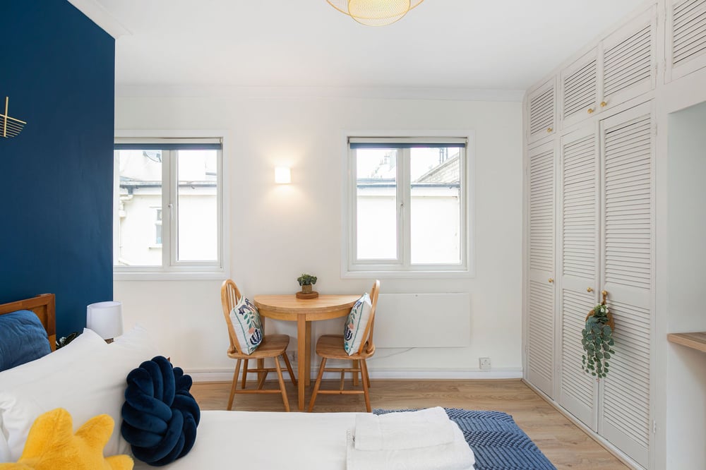 Welcome to your home in Bayswater! Set within a classic Victorian townhouse on one of West London's most recognisable streets, this studio has been thoughtfully designed for comfort and ease. The king-size bed is dressed in quality linens, and built-in wardrobe storage keeps the space feeling uncluttered and calm. Large windows draw in generous natural light throughout the day. Settle in at the dining area for two, catch a show on the smart TV with Netflix, or take advantage of the laptop-friendly workspace — perfect for those combining work with leisure. The fully equipped kitchen comes complete with a hob, oven, microwave, fridge-freezer, kettle, toaster, coffee maker, and all the cookware and crockery you need. A washing machine is available for longer stays. The private bathroom features a shower, bathtub, and a full set of toiletries and fresh towels — everything you need to feel right at home. The studio is professionally cleaned and prepared before every arrival. Enjoy your stay!