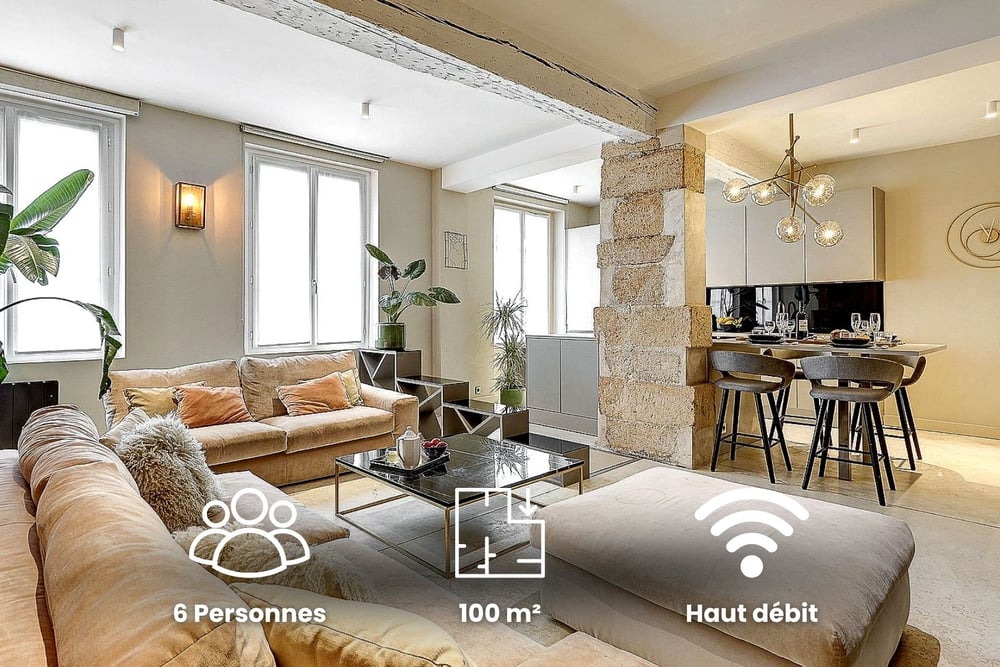 Immerse yourself in the unique atmosphere of a 100 m² apartment completely redesigned by an architect. Just steps from Le Marais and the Louvre, this refined space for up to 6 guests combines design, comfort, and modernity in a prime central Paris location.
