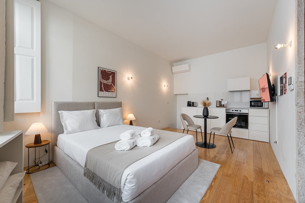 Bem-vindo ao meu estúdio! Este acolhedor estúdio de 40m² no Porto é o refúgio perfeito para os hóspedes que procuram conforto, conveniência e uma estadia memorável. A propriedade está localizada no rés do chão. A área de dormir apresenta uma cama queen-size de pelúcia vestida com roupa de cama de qualidade superior de hotel, garantindo noites tranquilas, e uma mesa de jantar. A kitchenette totalmente equipada tem tudo o que precisa para preparar refeições, incluindo um fogão, um forno, um micro-ondas e utensílios de cozinha e talheres essenciais. Para sua conveniência, a propriedade inclui uma máquina de lavar louça, tornando conveniente a limpeza depois de preparar uma refeição deliciosa, uma máquina de lavar roupa, uma máquina de secar roupa e equipamento de engomar para tratar das suas necessidades de lavandaria com facilidade. A moderna casa de banho está equipada com todos os elementos essenciais, incluindo toalhas limpas, um secador de cabelo e produtos de higiene pessoal gratuitos, garantindo uma estadia agradável e sem complicações. O estúdio é sempre limpo profissionalmente para seu conforto. Desfrute da sua estadia!